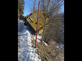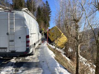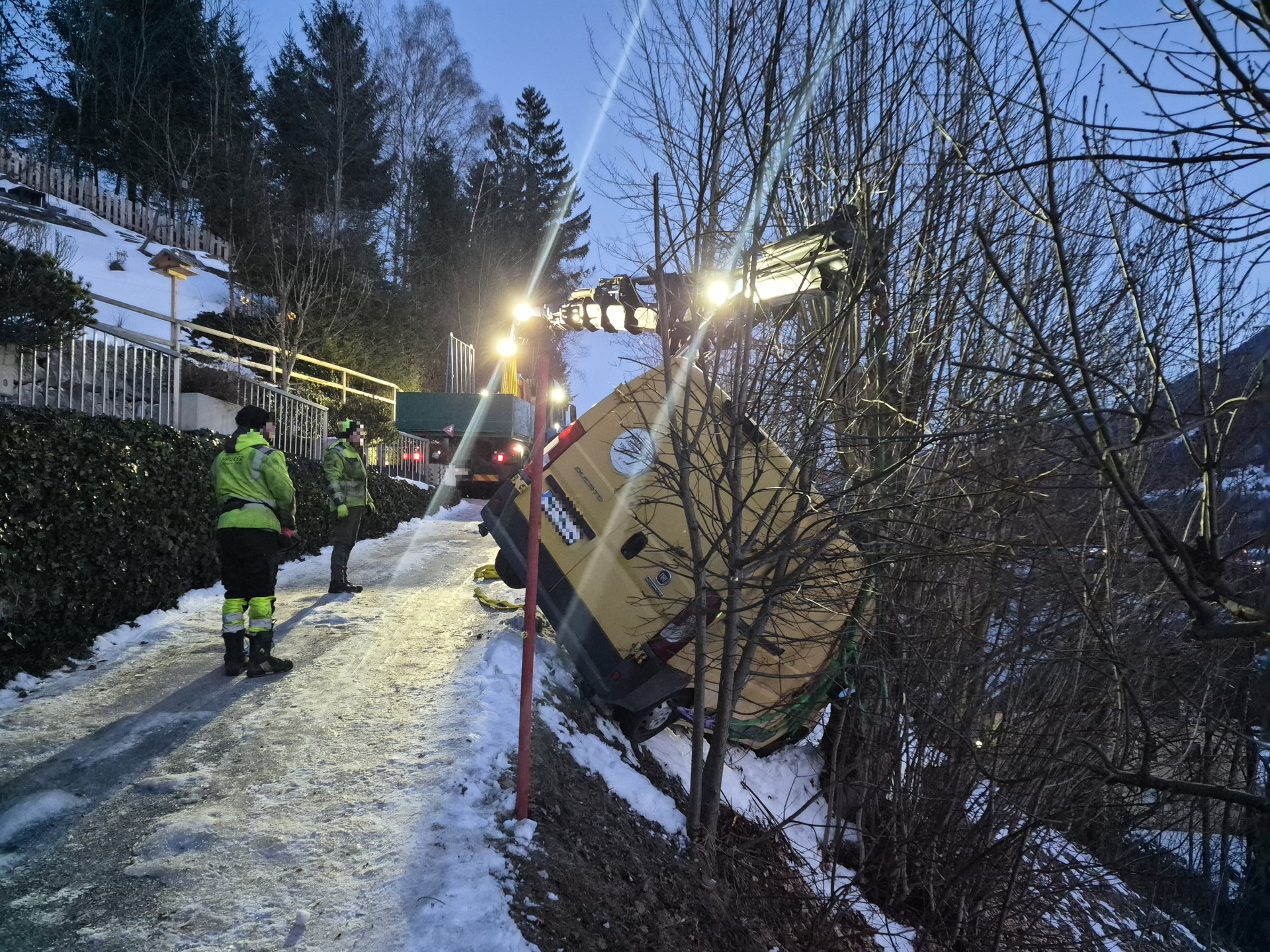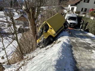 Nur einem glücklichen Umstand ist es zu verdanken, dass Schlimmeres verhindert wurde: Die Motorhaube des Kleinbusses blieb an einem Baum hängen, der das Fahrzeug stoppte und somit einen Absturz verhinderte. Der Lenker konnte sich unverletzt aus dem Fahrzeug befreien und die Einsatzkräfte alarmieren.