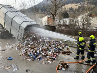 Durch den Einsatz eines Spezialfahrzeuges der Firma FCC Austria Abfall Service AG Rottenmann konnte der Container von der Kartonpresse getrennt und die Brandbekämpfung mit zwei Atemschutztrupps durchgeführt werden.