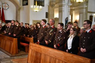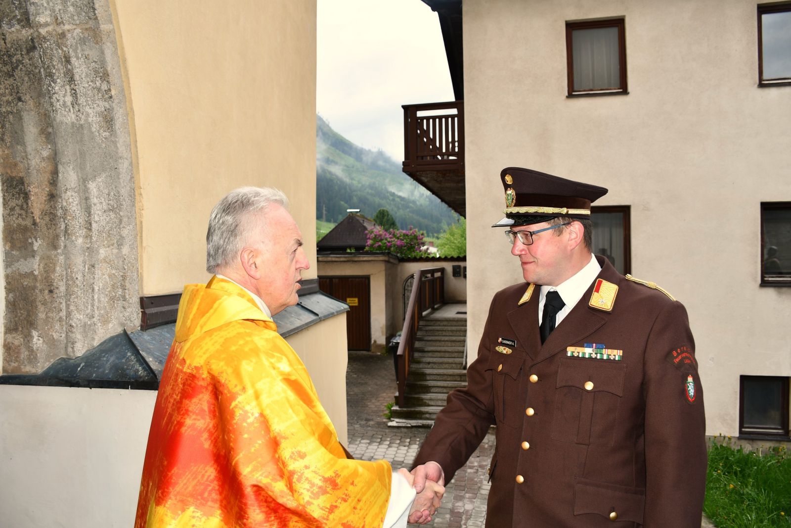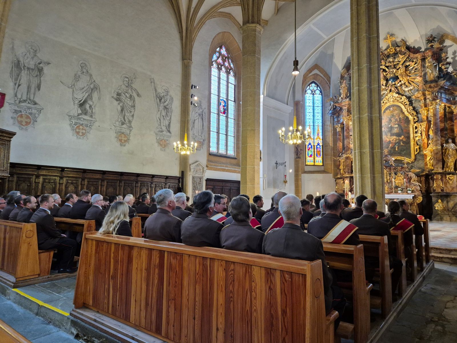 Nach dem Eintreffen am Kirchenvorplatz wurden die Abordnungen von Pfarrer Mag. Johann Huber empfangen und zogen mit drei Fahnen feierlich in die Stadtpfarrkirche ein. In seiner Predigt erinnerte der Pfarrer an die Werte des heiligen Florian – Mut, Hilfsbereitschaft und Nächstenliebe – und verband diese mit der heutigen Bedeutung des Feuerwehrwesens. Kamerad Max Schleinzer übernahm die Lesung, die Fürbitten wurden von Peter Radaelli vorgetragen.