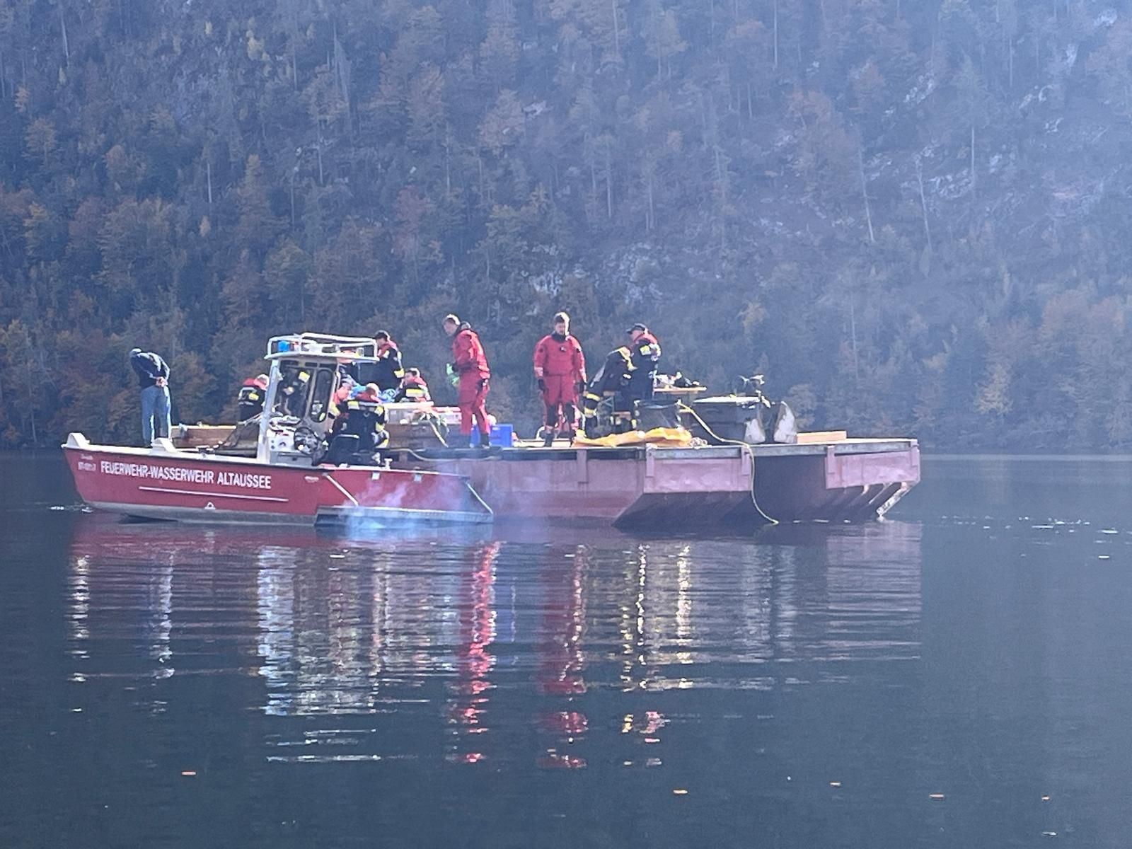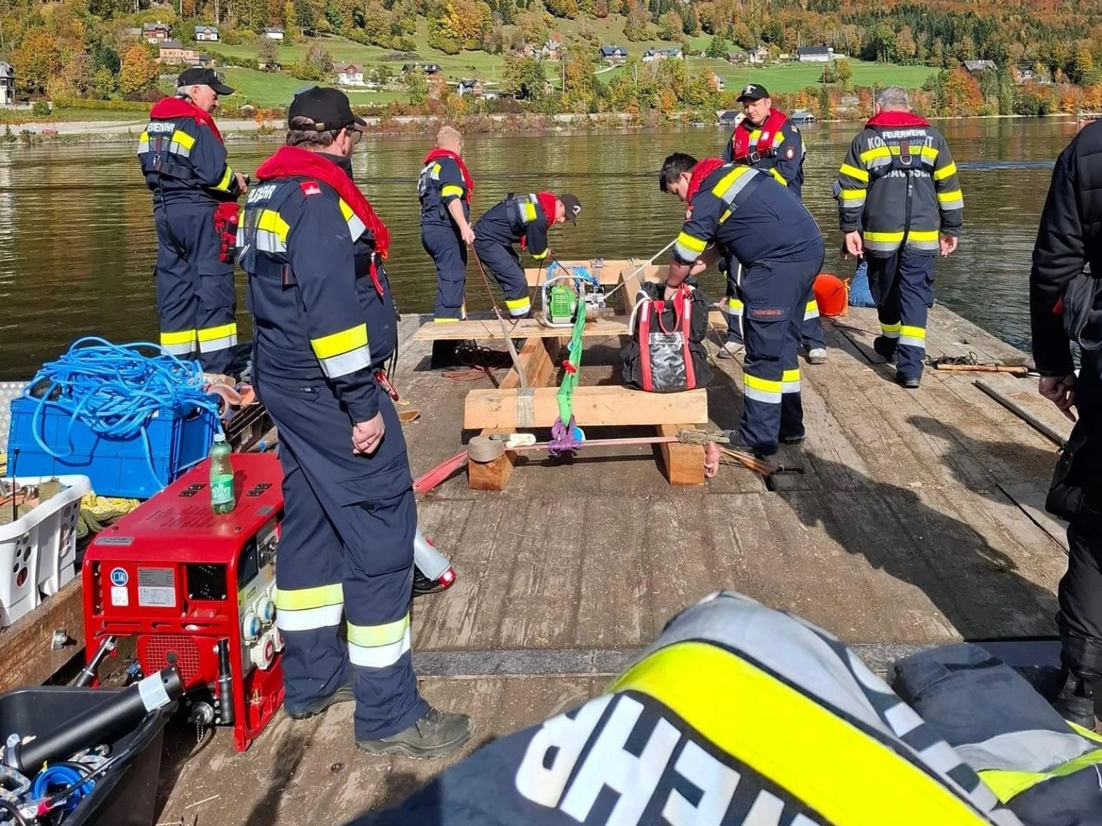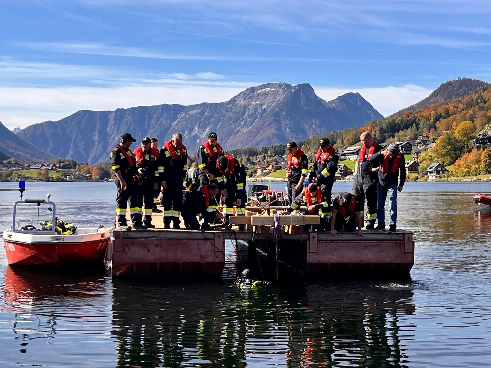 3 Feuerwehrboote, 9 Feuerwehrtaucher und 10 Hilfskräfte waren erforderlich, um dieses schwierige Unterfangen zu einem erfolgreichen Abschluß zu bringen. Unterstützt wurden die Feuerwehrtaucher von zwei Spezialtauchern aus Hallein, Christian Hölzl und Christian Kotrc, welche mit Spezialgeräten in einer Tiefe von 58 Metern das Boot an der Hebeeinrichtung befestigten. Dies war in kürzester Zeit erledigt und dann wurde es spannend, man wusste nicht, ob man das ca. 1500 kg schwere Boot aus dem Schlamm ziehen konnte. Die gesamte Hebeeinrichtung konnte auf ein Arbeitsponton der Fa. Wasserbau Peer aus Altmünster, welches zufällig in Grundlsee im Einsatz ist, und den Feuerwehren gratis zur Verfügung gestellt wurde, montiert und bedient werden. Dann ging es Schlag auf Schlag und das Boot konnte Meter für Meter nach oben gezogen werden. Beobachtet und gefilmt wurde die ganze Aktion durch einen Tauchroboter, welchen die BOKU Wien zur Verfügung stellte.